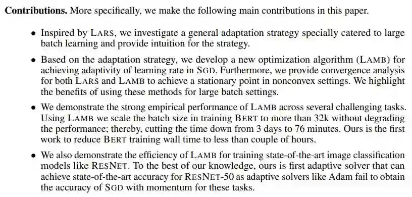 基于自适应策略,提出了一种新的优化算法(LAMB)来实现SGD中学习速率的自适应。此外,还提供了LARS和LAMB的收敛分析,以获得非凸情况下的一个驻点。我们将重点介绍在大型批处理设置中使用这些方法的好处。