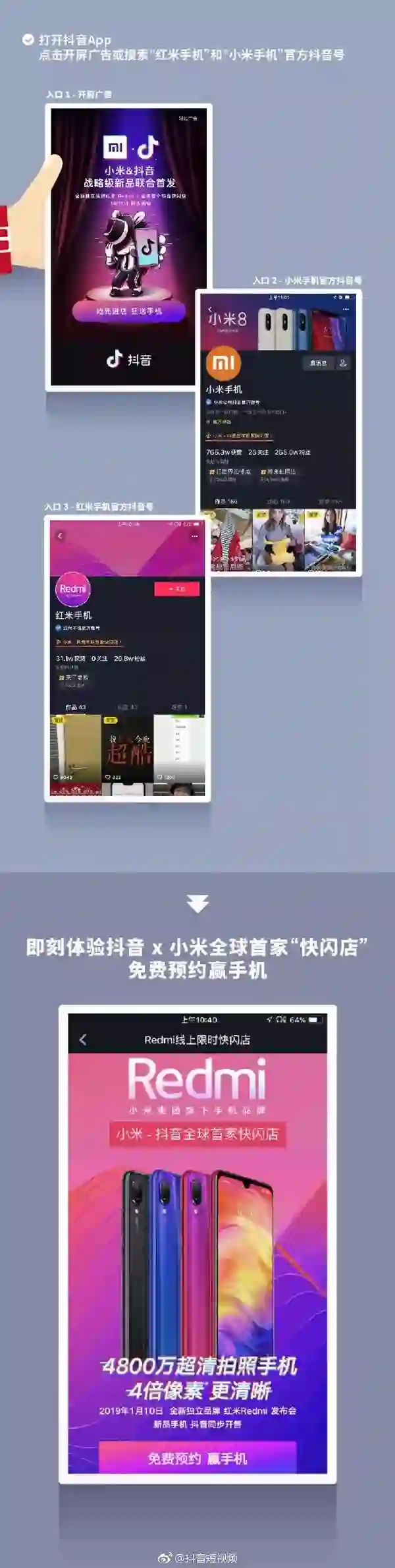 据了解,用户可直接通过抖音预约红米Redmi首款新机,1月10日正式发布后还可以直接在抖音购买。抖音官方公布了首个快闪店的入口:打开抖音App,点击开屏广告或搜索“红米手机”和“小米手机”官方抖音号。