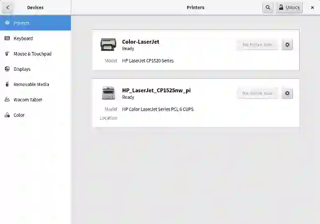 从 Linux 中设置一台网络打印机非常简单。我的桌面环境是 GNOME,你可以从 GNOME 的“设置”应用程序中添加网络打印机。只需要导航到“设备和打印机”,然后解锁这个面板。点击 “添加” 按钮去添加打印机。
