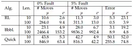 强化学习(RL)排序算法在学习智能体参数时,采用了对离散动作运行 AVI。训练智能体时根据经验使用了 15 轮迭代,生成参数包括了所有的负向元素。作为对比算法,冒泡排序算法反复扫描数组,并交换近邻的无序元素。而快排算法则会选定一个锚点元素,基于此创建大于、小于和等于锚点的三个子列表,在大于和小于子列表上做递归排序,最终将三个列表归并在一起。快排是一轮扫描算法,其中数组元素位置变动较大。而冒泡排序中,数组元素每次位置更改较小,但位置更改更为频繁。实验所用数据集包括 100 个具有 10 到 100 个随机抽取元素的数组,并在无错误和存在 5% 错误两种情况下衡量了算法的性能。