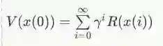 在一个确定性 MDP 中,元组(X,U,D,R)指定了一个标量回报函数,R:X→R。MDP 的解给出了一种控制策略 π: X→U,实现智能体生命周期中的折算累积回报(discounted cumulative reward)的最大化,即状态价值函数 (state-value function) :