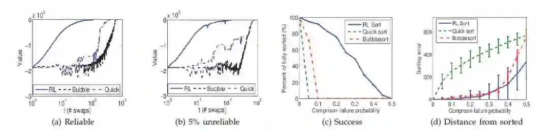 该论文主要针对软件开发领域问题。软件程序在开发中,通常并未考虑“韧性”(resiliency)和“稳定性”(stability),即程序是否可以从诸如内存芯片崩溃等一些开发中并未虑及的问题下存活。虽然软件开发的最佳实践一直在与时俱进,正如设计模式和正确性证明等,但是现有研究并未考虑到编程人员会出错误的问题,也没有考虑当失败条件或是错误出现时,程序运行过程中会表现出怎样的行为。由此,Faust 等人提出了引入机器人研究领域的方法去改进软件开发方法,采用“基于目标的任务”面对错误问题。为测试论文所提出的理论,论文研究者以数组排序为实际用例,实现了一种新的智能体。排序任务是计算机科学中的一个经典问题,可作为测试新软件方法的一个好任务。该程序称为 RL 排序算法,它使用强化学习的方法最大化回报,使用马尔科夫决策过程从变量空间的可能移动中做出选择。由此,排序程序的计算过程变成“在变量空间中的轨迹问题”。时间每推进一次,程序搜索“状态”和程序变量会发生相应的改变,进而发现用于正确排序数组元素的行动轨迹。论文进而对比测试了两种经典排序算法,即快排和冒泡排序。实验表明,在引入 5% 错误条件的情况下,虽然两种经典算法很快会出错,但论文提出的强化学习(RL)排序算法依然可以正确的执行。另一方面,在出现错误时,RL 排序算法给出的结果要更接近于完全正确排序的数组。此外,RL 排序算法在实现排序中操作的数组元素更少,因此性能也要优于其它两种对比方法。