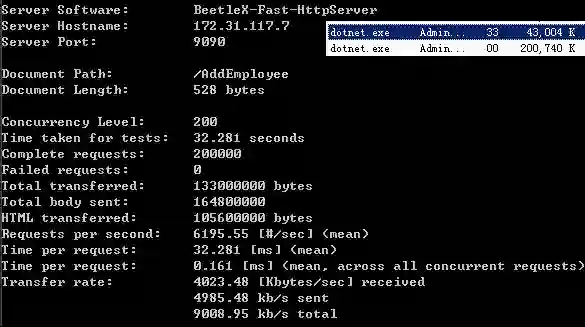 对比一下两者在accept connection上的性能差异,开启了两个AB实例同时进行压测,结果是FastHttpApi在处理并发数快高于Kestrel快一倍的情况,CPU使用率只有Kestrel的一半。