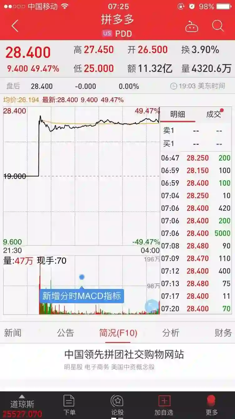 截至7时01分,拼多多股价报28.4美元,上涨49.47%,总市值超300亿美元。