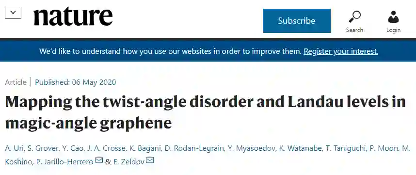 另一篇研究题为“Mapping the twist-angle disorder and Landau levels in magic-angle graphene”,研究团队致力于研究扭曲角的分布信息。他们以六方氮化硼(hBN)封装的 MATBG 为研究对象,使用纳米级针尖扫描超导量子干涉装置(SQUID-on-tip)获得处于量子霍尔态的朗道能级的断层图像,并绘制了局部 θ 变化图。该设备的相对精度达到 0.002 度,空间分辨率为几个莫尔周期。
