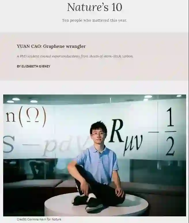 两年前,2018 年 3 月 6 日,国际顶尖学术期刊 Nature 连刊两文报道石墨烯超导重大发现,第一作者也是曹原。因为这两篇论文巨大的影响力,Nature 杂志发布的 2018 年度影响世界的十大科学人物,时年仅 22 岁的中国学者曹原位居榜首,