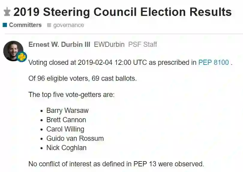 2 月 4 日,经过为期 2 周的投票,Python 社区选出了第一届的指导委员会的 5 名成员:Barry Warsaw、Brett Cannon、Carol Willing、Guido van Rossum、Nick Coghlan。