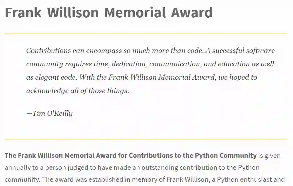 注:弗兰克·威利森纪念奖,即 Frank Willison Memorial Award,该奖由 O'Reilly 出版集团设立,颁布给为 Python 社区做了突出贡献的个人。设立于2002年,每年颁布一次。