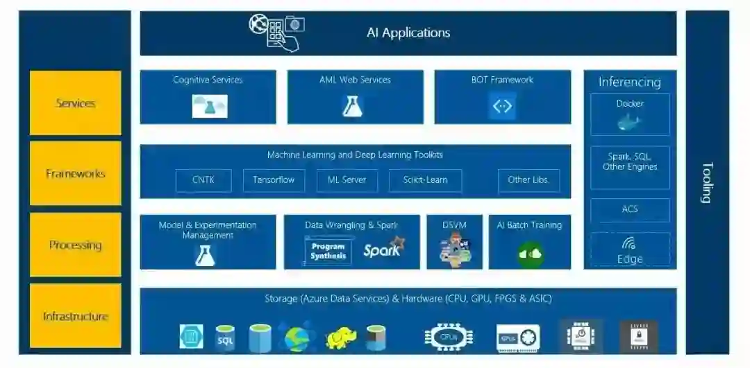 三,AI 算法。提供成熟的 AI 算法供应用开发者使用,例如让微软认知工具包 CNTK 与 TensorFlow、Caffe 等框架实现灵活转换,在一种框架下训练好的模型,可以在另一种框架下无缝使用,并将更多算法集成到 Visual Studio 中去。