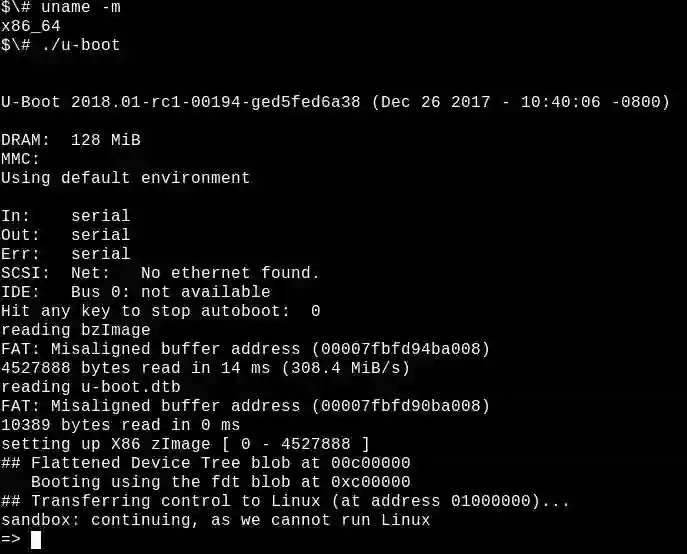 在构建主机上的沙盒中运行 U-boot 引导程序。