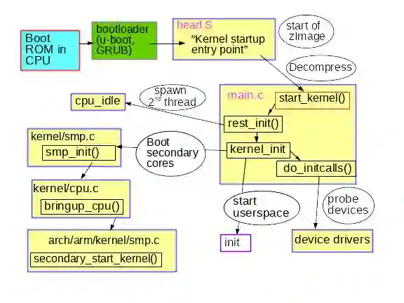 用 GDB 检查内核的启动给出了答案。首先安装内核的调试软件包,内核中包含一个未剥离的unstripped vmlinux,例如 apt-get install linux-image-amd64-dbg,或者从源代码编译和安装你自己的内核,可以参照 Debian Kernel Handbook 中的指令。gdb vmlinux 后加 info files 可显示 ELF 段 init.text。在 init.text 中用 l *(address) 列出程序执行的开头,其中 address 是 init.text 的十六进制开头。用 GDB 可以看到 x86_64 内核从内核文件 arch/x86/kernel/head_64.S 开始启动,在这个文件中我们找到了汇编函数 start_cpu0(),以及一段明确的代码显示在调用 x86_64 start_kernel() 函数之前创建了堆栈并解压了 zImage。ARM 32 位内核也有类似的文件 arch/arm/kernel/head.S。start_kernel() 不针对特定的体系结构,所以这个函数驻留在内核的 init/main.c 中。start_kernel() 可以说是 Linux 真正的 main() 函数。