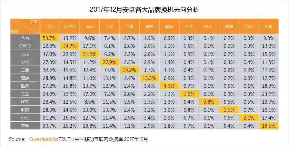 数据显示,安卓终端的换机率基本保持在4-5%。换机之后是否选择本品牌,可以近似理解为用户的忠诚度。