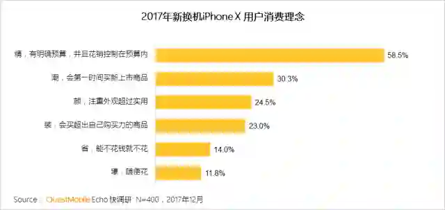 QuestMobile调研数据显示,近6成用户的消费理念是“精打细算”,超3成用户是“追求新潮”,超四分之一的用户“看重颜值”,只有不到四分之一的用户“装壕”和十分之一的用户是“真壕”。综合来说,大部分用户购买iPhoneX属于理性消费。