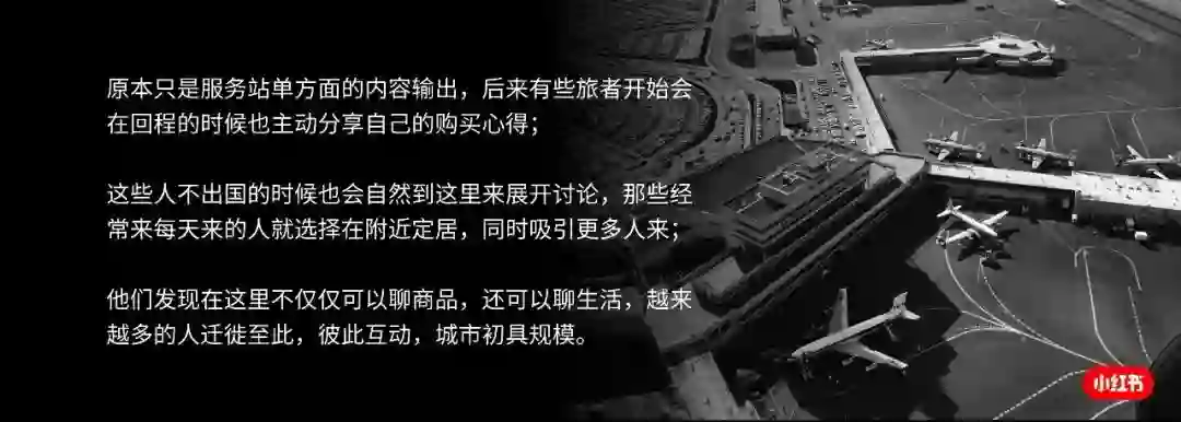 然后有些游客在回程的时候也会尝试在这个机场的服务站有所逗留,主动分享一些自己刚刚结束的旅程的购买经验,因为这些分享比我们服务站原本提供的信息更加实时,这些分享者的叙述也更加生动,所以之后那些即将出行的人们也更愿意倾听之前游客们的分享,很自然的我们作为服务站就不再提供官方攻略信息了,但是服务站作为一个场所却吸引了越来越多的人,越来越多的准备出行的人会过来倾听,越来越多的旅途归来的人不愿离去,这个群体越来越大,一个服务站已经无法负荷,人们开始选择在附近定居,大家分享和交流的话题也不限于在海外买什么东西,开始讨论即使在国内有什么东西值得买,然后在日常生活中有什么餐厅酒店值得分享,学生党交流如何学英语如何考研,妈妈们交流如何备孕和培养宝宝,这样的正向循环和吸引力让越来越多的人迁徙至此,小红书这座城市也初具规模。