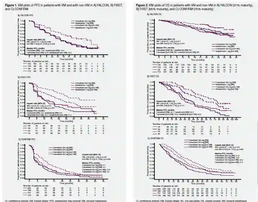 2.【FIRST/FALCON/CONFIRM内脏转移 VS 非内脏转移的亚组分析】相较于内脏转移患者,非内脏转移的HR+ABC患者更能从氟维司群500mg治疗中获益:这项研究纳入FIRST/FALCON/CONFIRM三项研究中绝经后的局部进展或转移性乳腺癌患者,旨在分析使用氟维司群500mg在内脏转移者与非内脏转移者中的疗效差异。结果显示,氟维司群500mg 较对照组在非内脏转移患者中明显改善患者的PFS、OS及CBR。在内脏转移患者中,氟维司群与对照组未见明显差异。