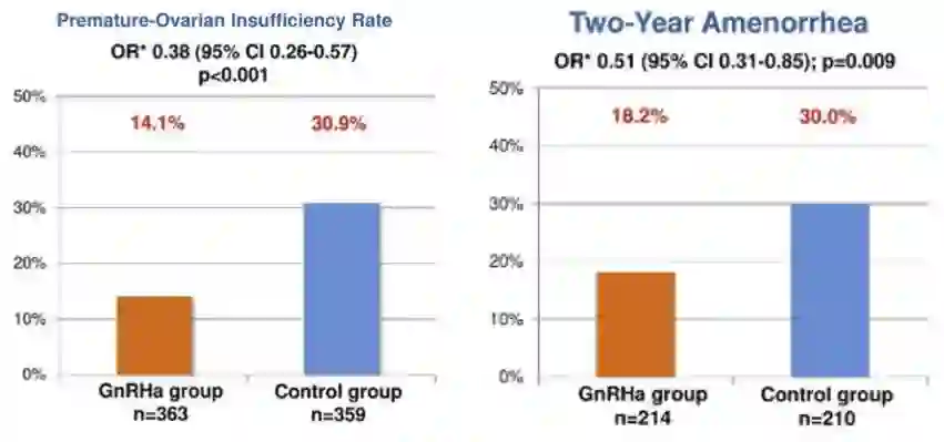 2. 【卵巢保护五个随机试验的汇总分析】化疗期间使用GnRHa可以有效保护卵巢功能并且不影响后续生存: 该研究共纳入5项随机临床实验873例患者数据进行分析,对早期乳腺癌患者在化疗期间使用GnRHa进行卵巢功能抑制的有效性(卵巢功能和生育保护)和安全性(生存结果)进行了探讨。结果显示:GnRHa显著降低POI的发生率, GnRHa组显著低于对照组﹙p<0.001﹚,其结果在各亚组中保持一致。GnRHa显著降低化疗后2年的闭经率(p=0.009)。化疗期间使用GnRHa进行短暂卵巢功能抑制可以显著提高治疗后续的怀孕率(10.3% VS 5.5%,IRR=1.83, 95%CI 1.06-3.15,p=0.03),实现怀孕者全部集中在≤40岁的年龄组。无论是ER+还是ER-乳腺癌,化疗期间使用GnRHa进行卵巢功能抑制并不会影响DFS(P=0.999)和OS(P=0.083) 。
