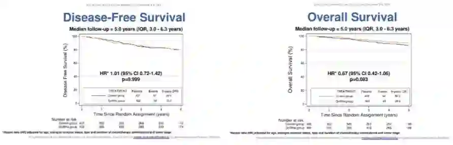 TEXT & SOFT联合分析: OFS+AI较OFS+TAM显著改善8年DFS(86.8% vs 82.8%,HR=0.77;95%CI,0.67-0.90, P<0.001)、BCFI(HR=0.74;95%CI,0.63-0.87)以及DRFI(HR=0.80;95%CI,0.65-0.96)。相较于TAM+OFS,AI+OFS能够持续减少复发风险,虽然并没有看到总生存的获益。在安全性方面,OFS+AI与OFS+TAM无显著差异。