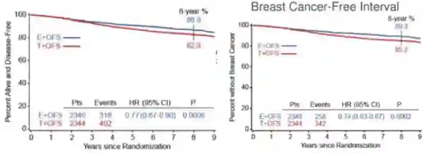 1. 【SOFT/ TEXT & SOFT联合分析8年随访数据更新】 OFS+TAM/AI显著改善绝经前激素受体阳性早期乳腺癌整体人群DFS,一举颠覆了之前整体人群阴性结果的结论。TEXT/SOFT联合分析继续强有力的证实OFS+AI优于OFS+TAM。