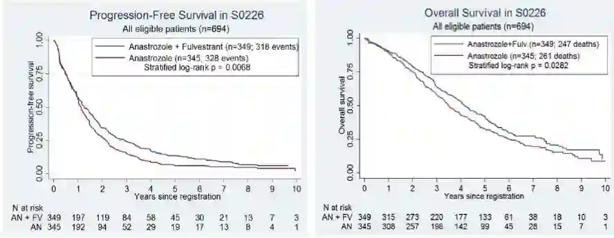 1.【SWOG0226研究】氟维司群联合阿那曲唑仍较单药阿那曲唑的使用显著的延长了PFS和OS:该Ⅲ期临床研究纳入694例绝经后激素受体阳性的转移性乳腺癌患者,旨在观察氟维司群250mg+阿那曲唑1mg对比阿那曲唑1mg一线治疗绝经后HR+MBC疗效。本次公布这项研究的最终生存分析,提示氟维司群联合阿那曲唑显著延长患者PFS(15.0 vs 13.5个月 p=0.007)。OS分析结果显示,氟维司群+阿那曲唑较阿那曲唑显著延长OS(50 vs 42个月, p=0.028 )。