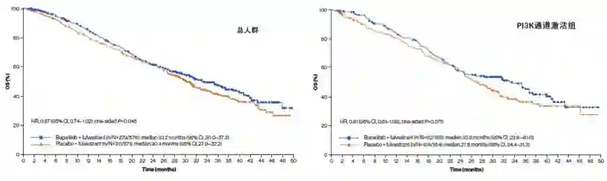 3.【BELLE-2 研究】氟维司群联合Buparlisib对比氟维司群单药在总体人群中并未提高患者的OS,仅在PI3K通路激活状态的人群中存在获益:这是一项评价PI3K 抑制剂Buparlisib联合氟维司群对比单用氟维司群治疗AI治疗失败的HR+ABC患者的疗效,该研究纳入1147名患者,1:1随机入组氟维司群联合Buparlisib组(n=576)或氟维司群联合安慰剂组(n=571)。更新的BELLE2研究最新随访数据显示,氟维司群联合Buparlisib组对比氟维司群联合安慰剂组在整体人群中虽有OS的获益趋势,但没有统计学意义(单侧P=0.045)。在PI3K通路激活状态的人群中,氟维司群联合Buparlisib组改善OS约6个月(双侧P=0.075)。在ctDNA PIK3CA突变的患者中,氟维司群+Buparlisib组 vs 氟维司群+安慰剂组有获益趋势(双侧P=0.127)。而在ctDNA PIK3CA未突变的患者中,两组比较无统计学意义(双侧P=0.774)。而联合组的不良事件显著高于氟维司群单药组。从更新的BELLE2研究结果可知,氟维司群联合Buparlisib对比氟维司群单药在总体人群中并未提高患者的OS,仅在PI3K通路激活状态的人群中存在获益,且联合治疗3/4级不良事件更多。