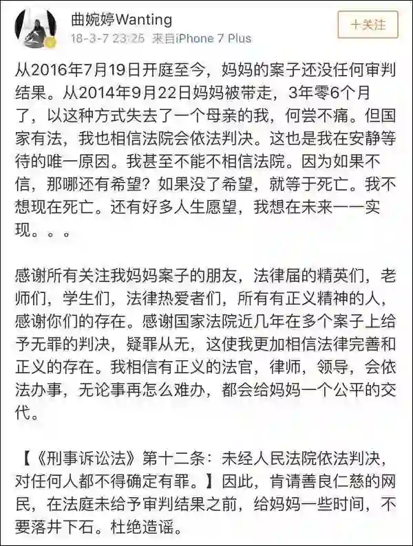 曲婉婷将母亲视为自己的英雄,她曾因发表“妈妈给了我最好的生活,无论她为此付出了怎样的奋斗”遭到网友痛骂。从2016年起,她会不定时出现在社交平台为母亲喊冤。但讽刺的是,她并未出现在2016年7月的庭审现场。自母亲受审后,这位“孝顺”的女儿长居温哥华。