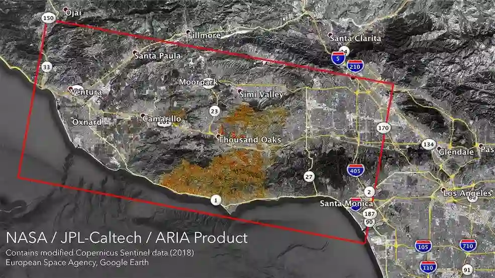 除了 Terra 卫星之外,NASA 喷气推进实验室(JPL)旗下的先进快速成像与分析项目小组(Advanced Rapid Imaging and Analysis,ARIA)也参与到了火灾的监督之中,他们使用欧空局(ESA)运营的哥白尼哨兵 1 号卫星(Copernicus Sentinel-1)提供的合成孔径雷达卫星图像制作了新的火灾分析图。