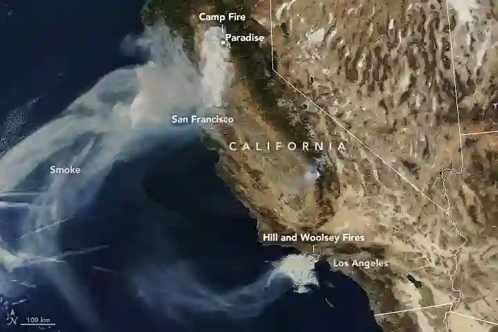 2018 年 11 月 8 日,几乎就是在同一天之内,美国加州连续发生了多场大规模的山林大火,其中尤以北加州的 Camp Fire 和南加州的 Woolsey Fire 最为严重,截止 11 月 14 日,已经造成 48 人死亡,被大火吞噬掉的土地面积超过 840 平方公里,预计到月底才能基本将大火扑灭。