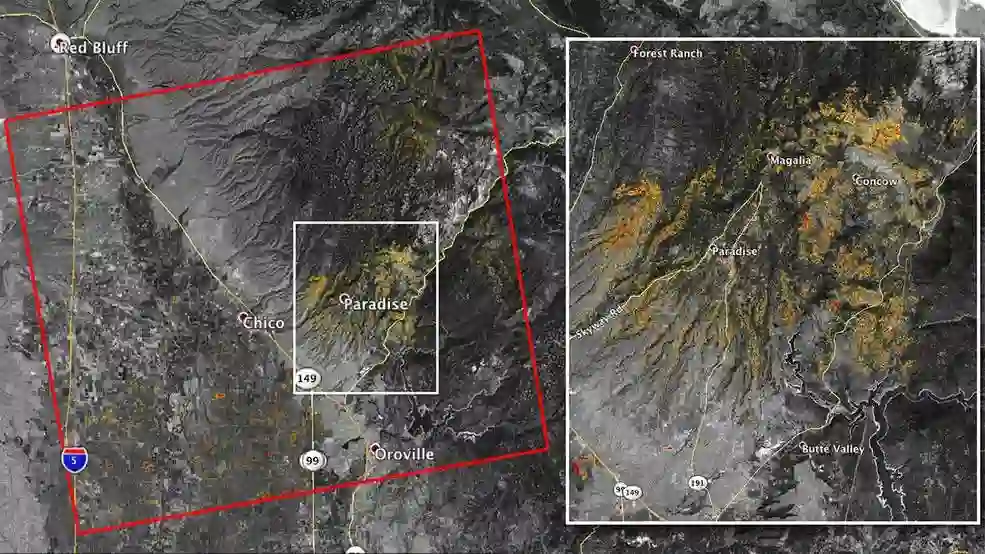 图丨加州可能受到 Camp Fire 破坏的地区(来源:ARIA)