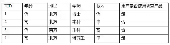 如下表是用户是否使用某产品的调查结果( )请计算年龄、地区、学历、收入中对用户是否使用调查产品信息增益最大的属性。(