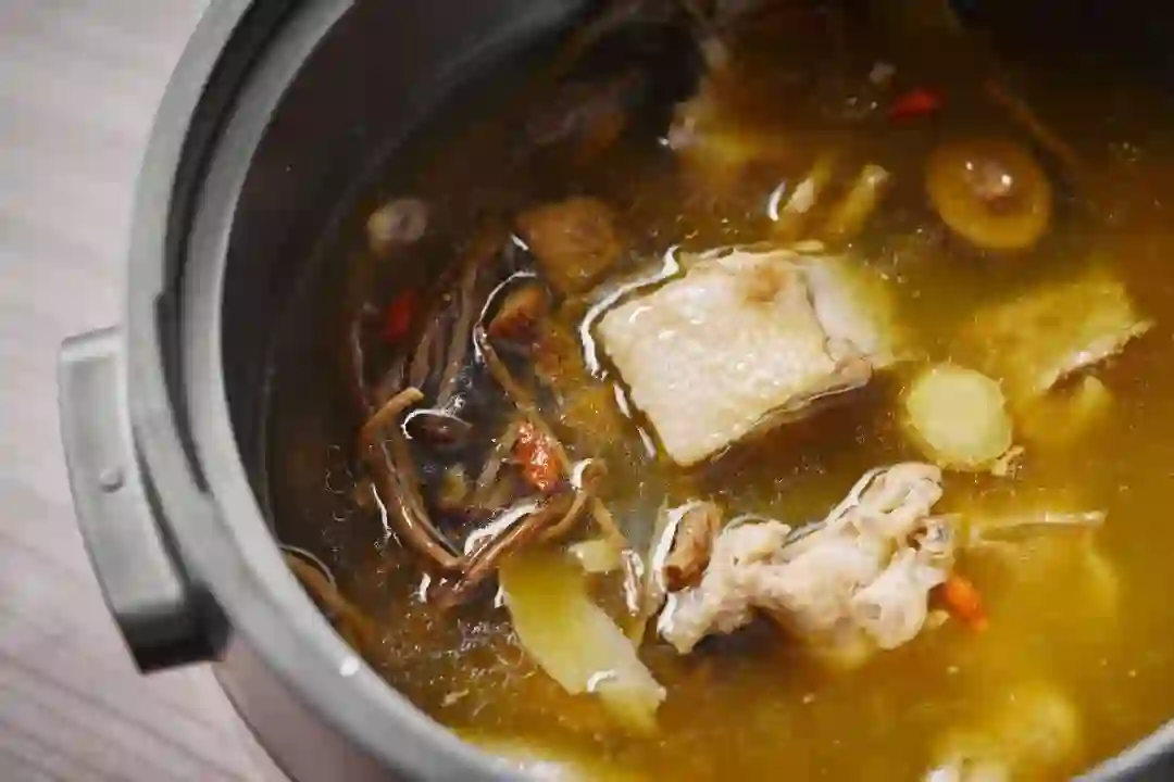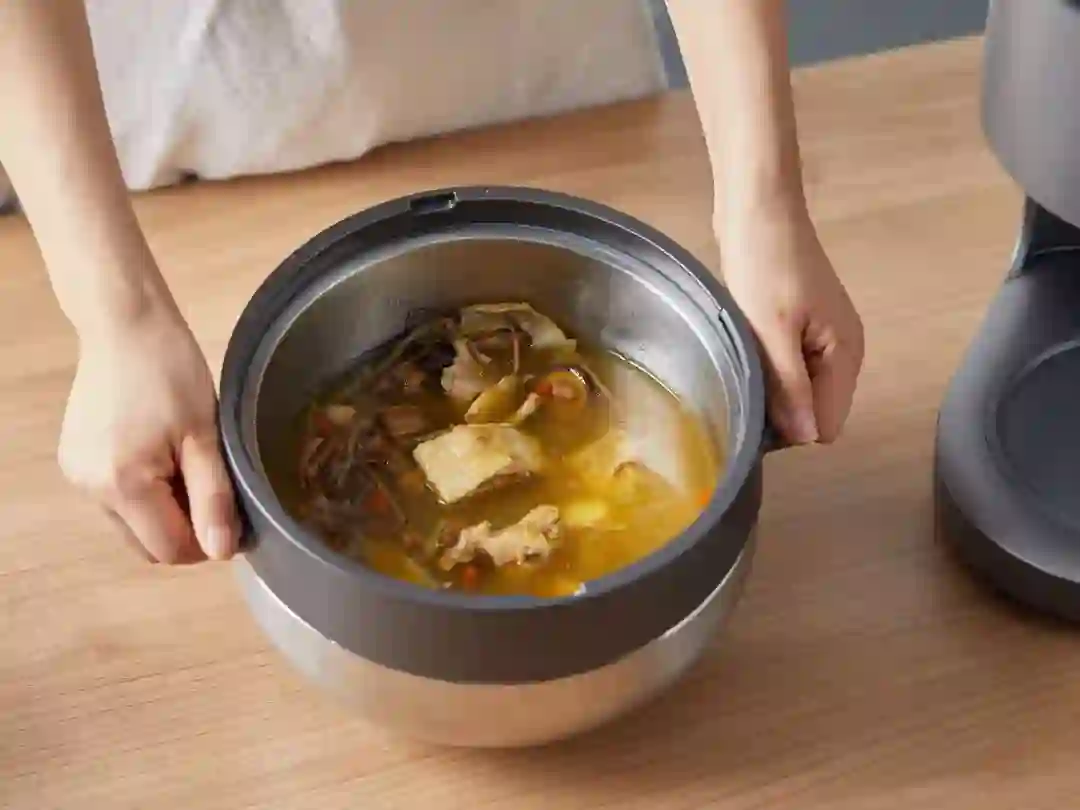 把所有食材放进内胆,选择“汽锅鸡”模式,按启动键,制作开始。一个小时后,汽锅鸡制作完成。