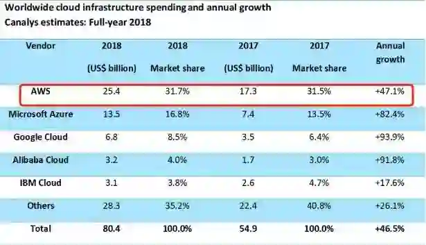 2018年全球云服务商所占份额(图片来源:Canalys)