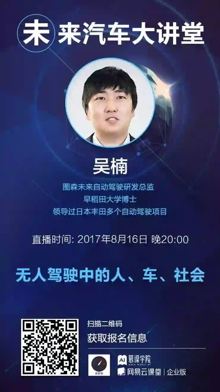 即将开启的下一期讲座,8月16日周三晚上8点,我们邀请到的讲师是早稻田大学博士、图森未来自动驾驶研发总监吴楠。