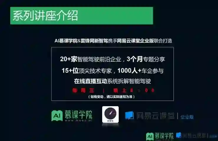 雷锋网 · 新智驾(微信公众号AI-Drive)持续关注和报道智能驾驶领域的一线动态。从6月份开始,我们联合雷锋网· AI慕课学院、网易云课堂企业版正在举办系列智能驾驶讲座(见头图),邀请业界、学界顶尖专家共同打造一场智能驾驶技术盛宴。