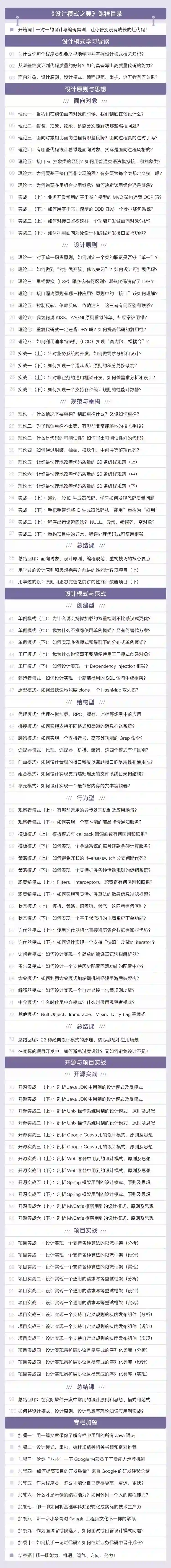看了这个专栏的目录和内容,可以说《设计模式之美》是我看过市面上最实用的设计模式课:使用真实项目代码讲解,能真正提升你的代码能力,让编程内功转化为直接开发生产力。
