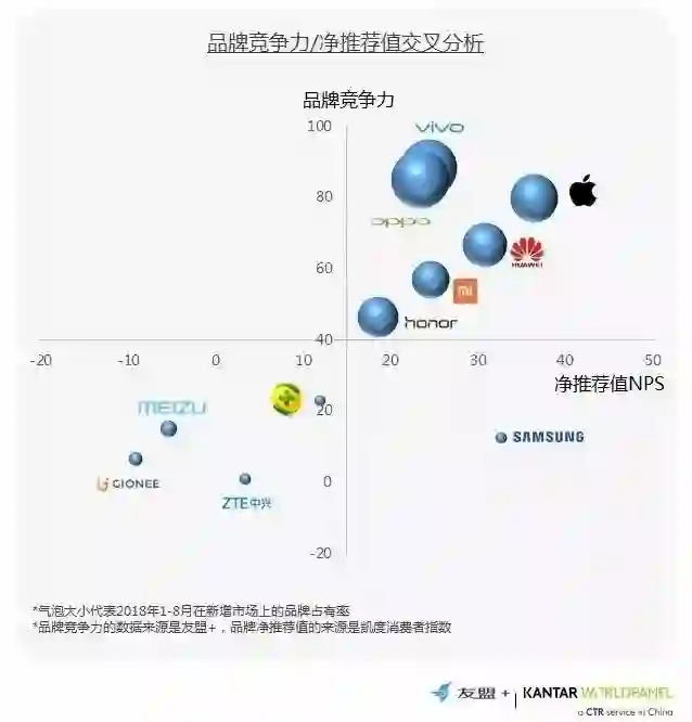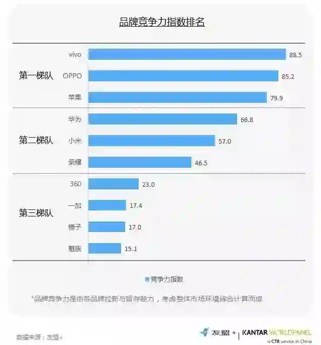 2、vivo、OPPO、苹果品牌竞争力排名第一梯队