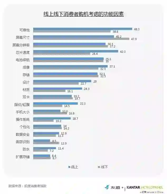 7、线上用户更关心可靠性和芯片速度,线下用户更重视屏幕尺寸