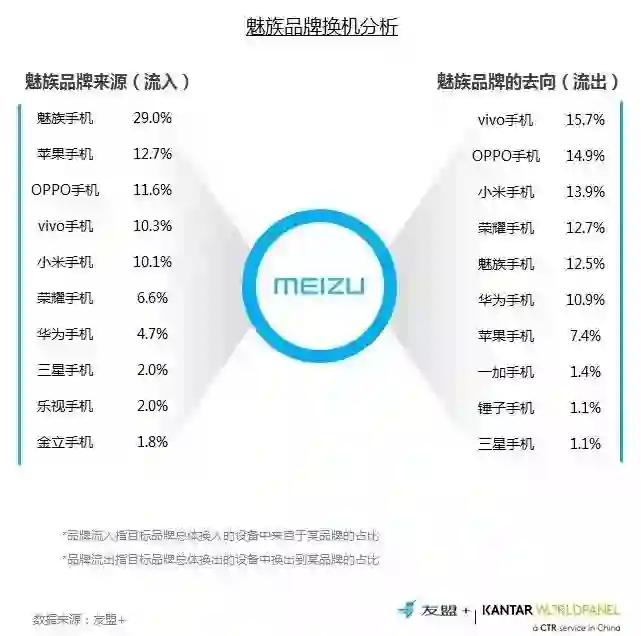 18、换机流向分析:魅族流向情况不太理想,相比于29%的流入,流出到品牌自身的占比仅为12.5%