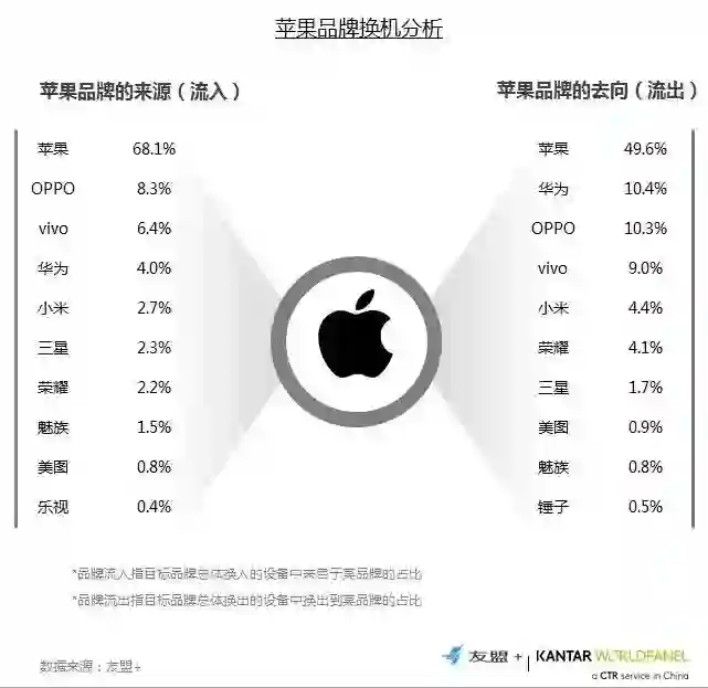 11、换机流向分析:苹果用户流入流出品牌主要都以苹果为主,换机大多在品牌内完成,用户忠诚度高;同时,流出到华为、OPPO与vivo