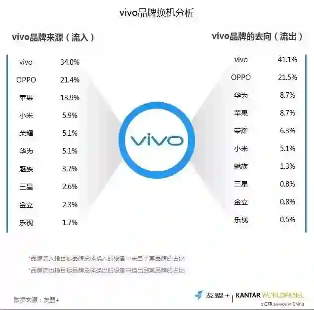 9、换机流向分析:vivo的流入和流出以vivo和OPPO为主,超过55%的流转发生在OV品牌之间