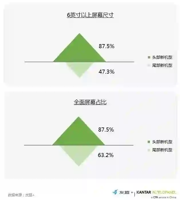7、用户的手机屏幕集中向大于5.6寸和70%以上屏占比转化
