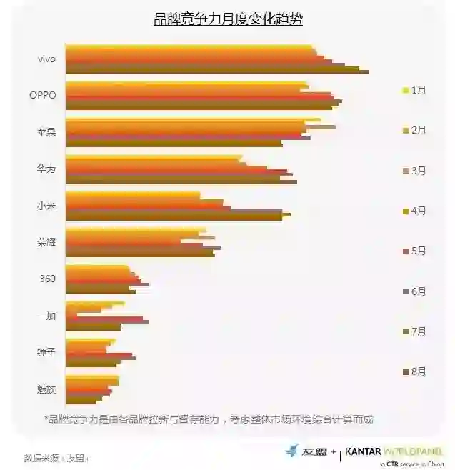 3、1-8月,安卓品牌呈现了不同程度的竞争力提升,尤其是vivo、华为和小米。苹果新机能否扭转竞争力下滑趋势值得观注