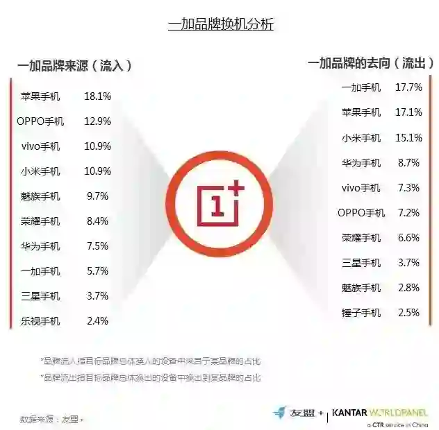 16、换机流向分析:一加品牌用户来源分散;与其他品牌相比,一加用户的换机品牌忠诚度相对较低