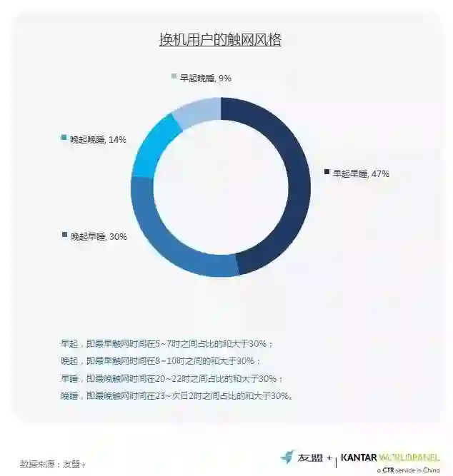 10、47%早起早睡用户的触网时间在5-7点到20-22点之间,使用手机时长跨度为15小时