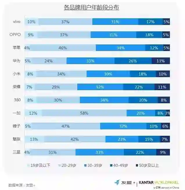 5、OV和魅族在20岁以下渗透较强;苹果、一加、锤子和魅族用户较为集中在20-29岁和30-39岁;华为用户偏成熟/年长
