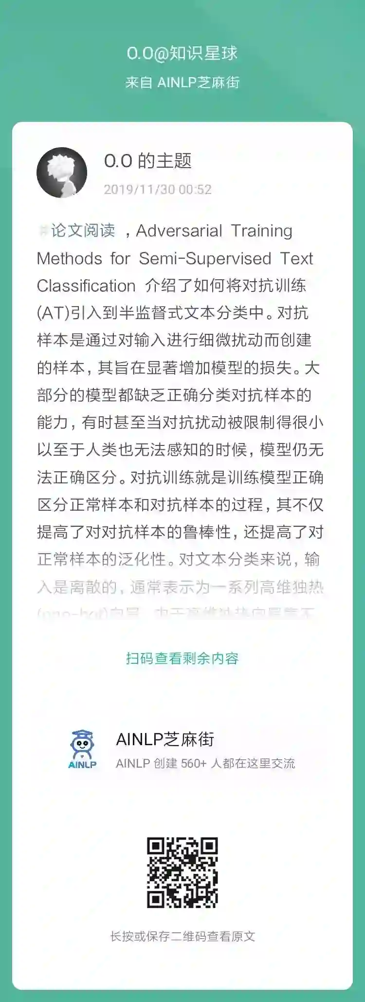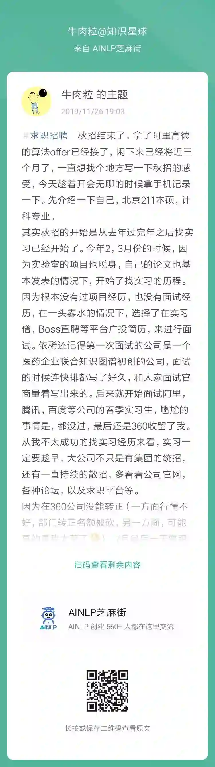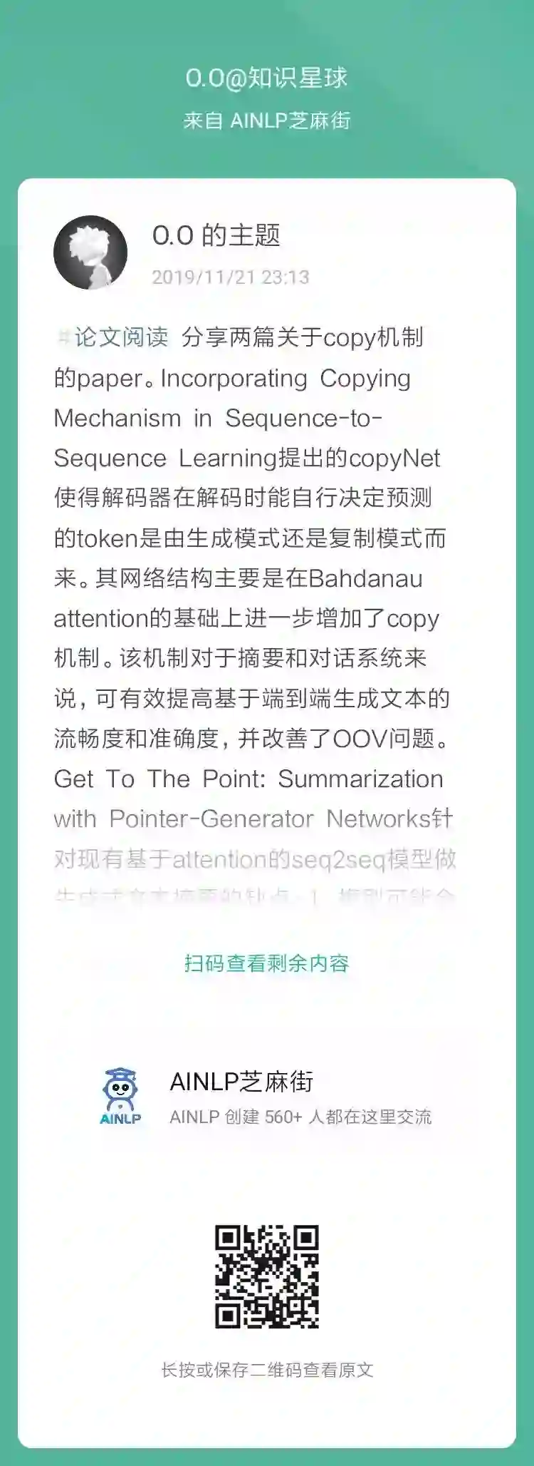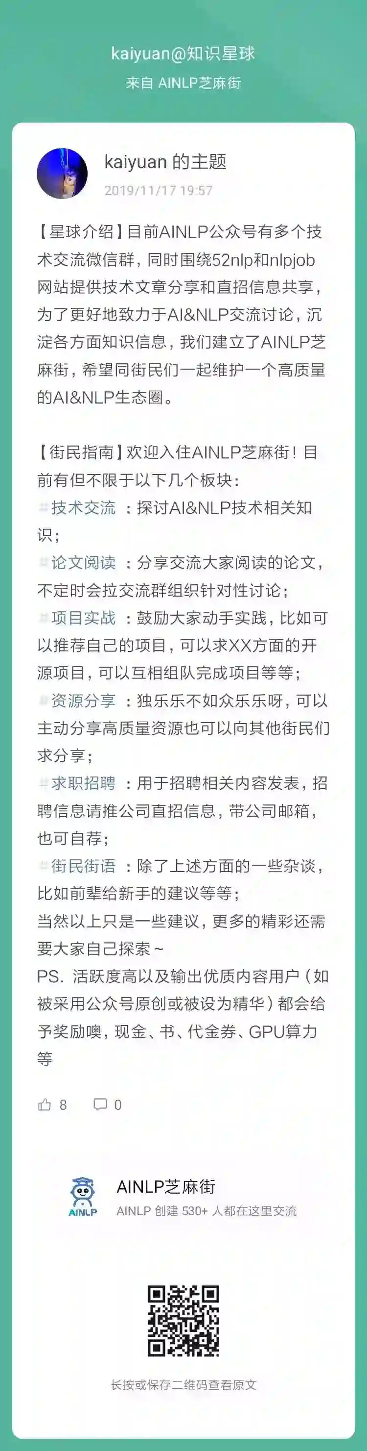 高开远同学和我创建了一个免费知识星球: AINLP芝麻街,初期目的主要是串一下微信群,对一些技术点做标签化管理,感兴趣的同学可以加入,需审核,申请时请务必大概介绍一下学校/公司,目前研究方向,以及加入星球目的,不填写任何内容直接申请的暂时不会通过,欢迎大家来一起玩。