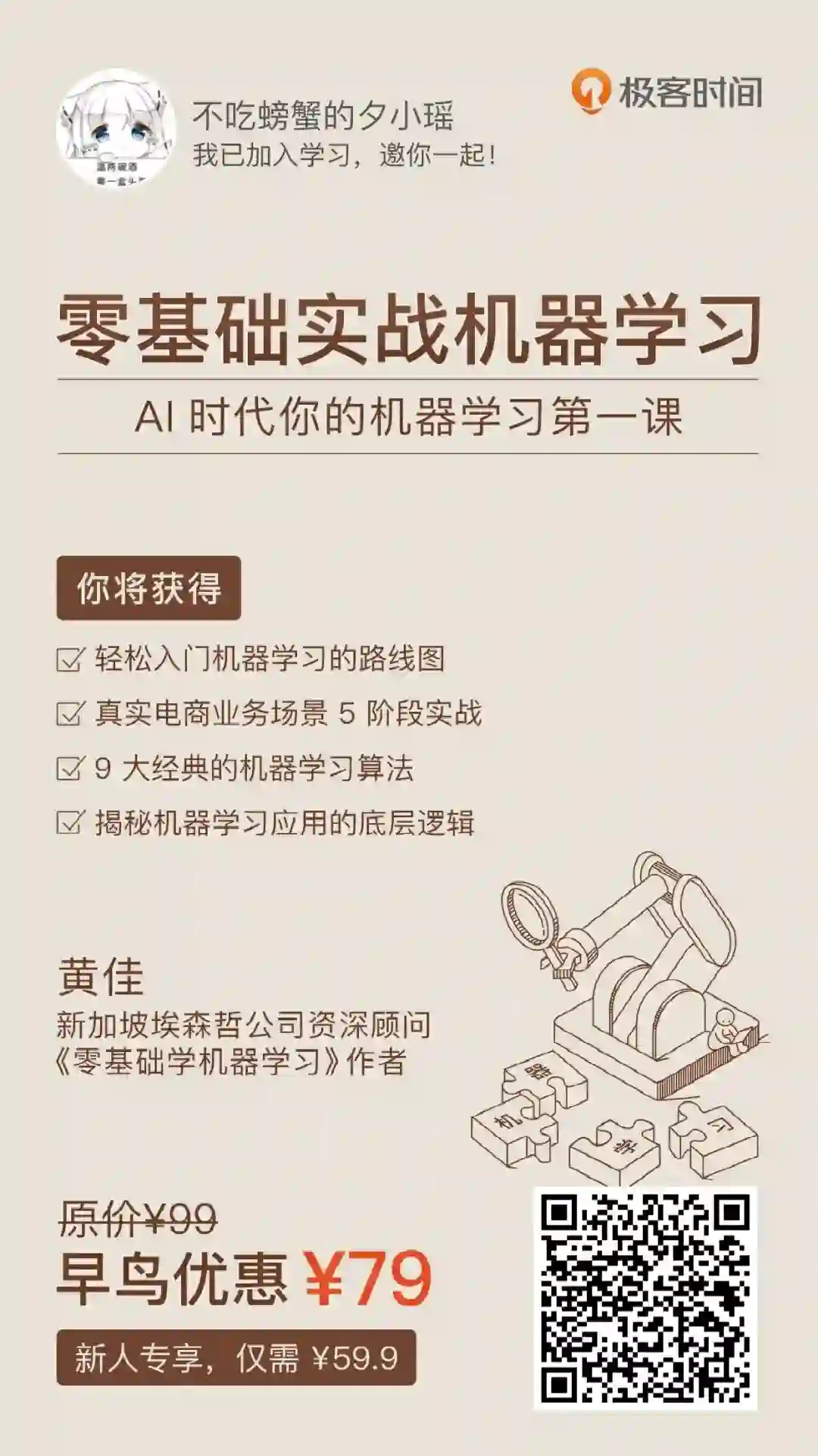 能做到这一点的学习资料,并不多。很难得,最近看了黄佳写的《零基础实战机器学习》专栏,就是基于入门机器学习初学者的痛点问题,结合真实业务场景的项目,通过“实战闯关”的方式,让你轻松入门机器学习。而且手把手教你针对项目,搜寻合适的算法,找到最合适的包来完成项目。