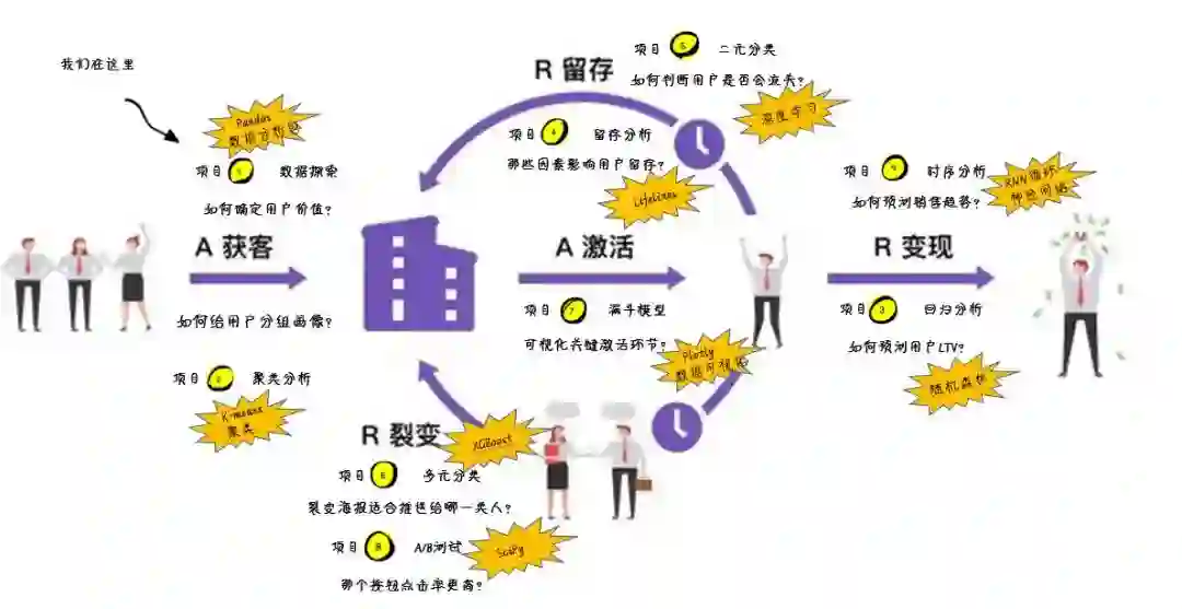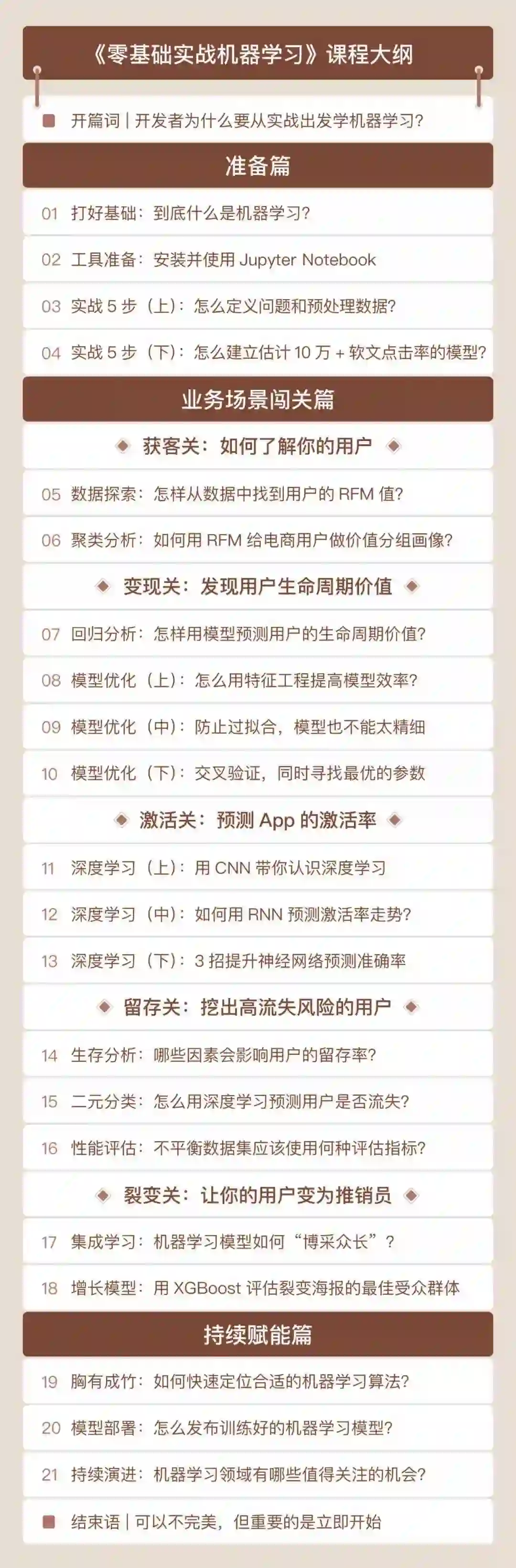 这个部分结合“易速鲜花”这个网络鲜花速递平台的电商场景,设置了获客关、变现关、激活关、留存关、裂变关 5 大关卡。就算没接触过运营场景,也能够完全理解。而且在学机器学习的同时,你还能学到运营的技巧,可谓一举两得。