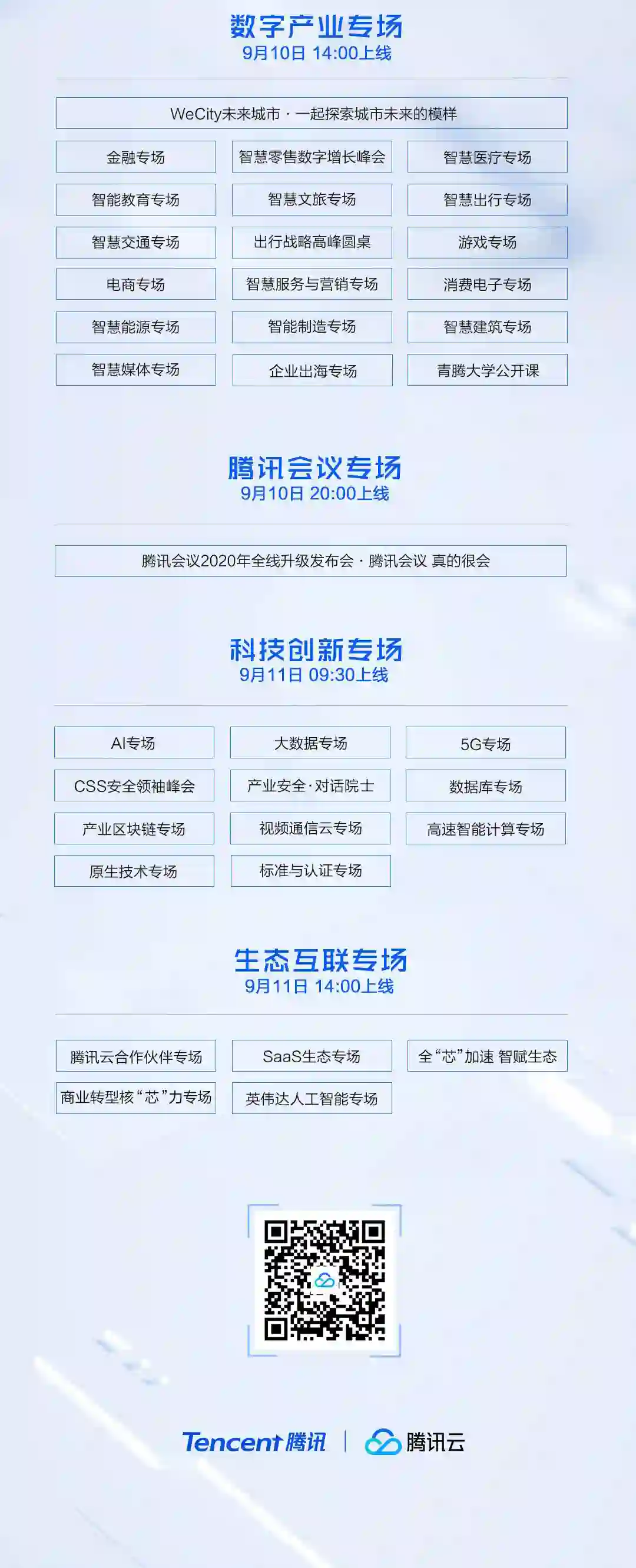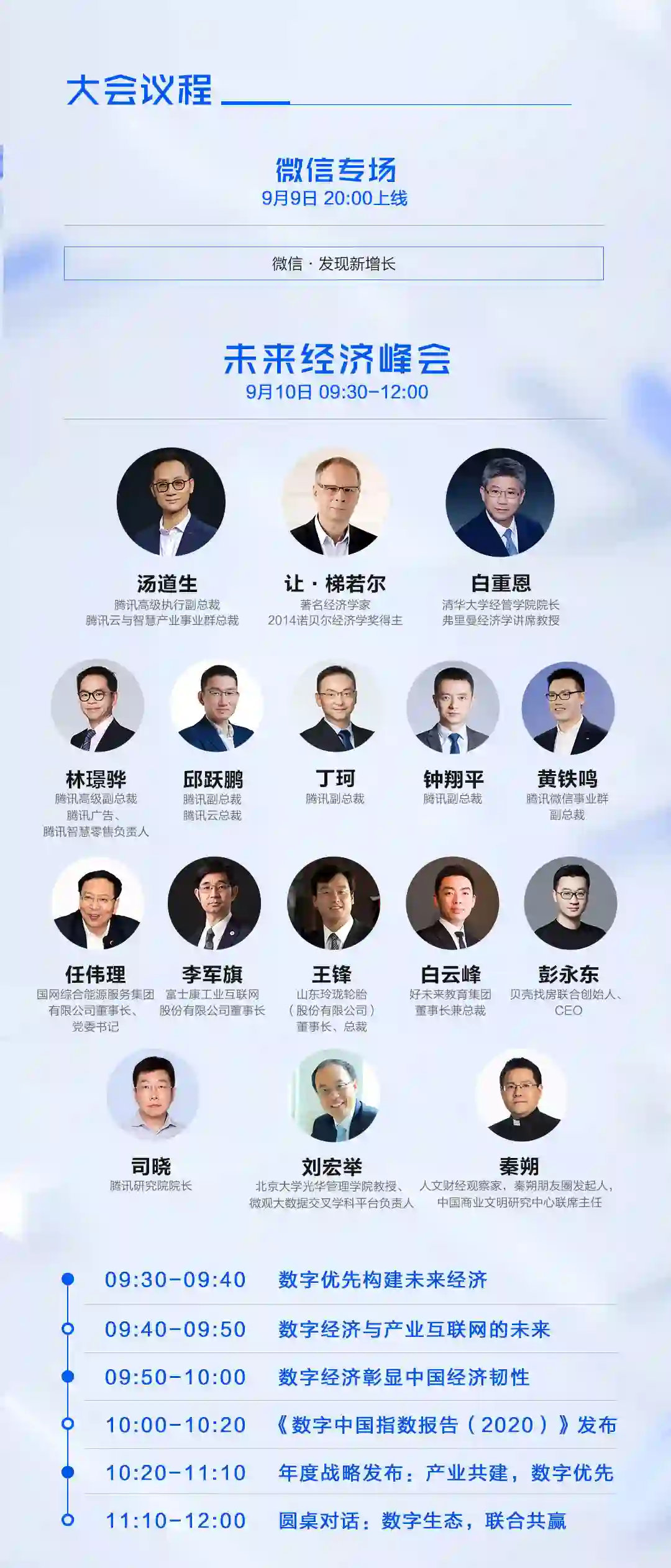 9月10日是大会的高潮部分,以产业互联网落地各行各业为主线,结合产业现状,腾讯产品和解决方案以及落地案例展示技术赋能百业的成果。包含未来经济峰会,青腾大学公开课,腾讯会议升级发布会以及18个垂直行业/领域专场。