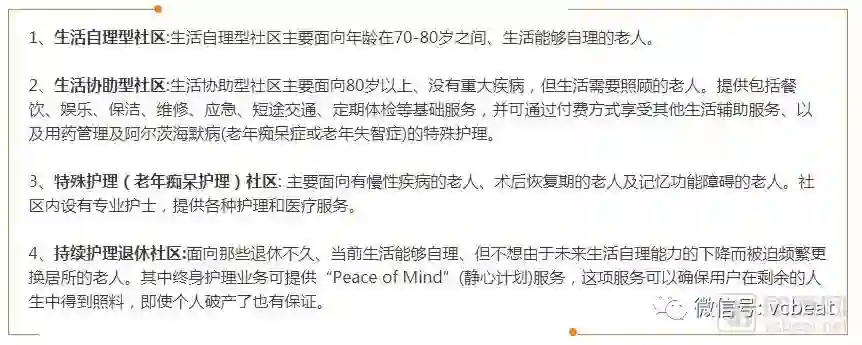 Brookdale公司运营的服务类型,主要包括生活自理型社区、生活协助型社区、特殊护理(老年痴呆护理)社区,以及持续护理退休社区。