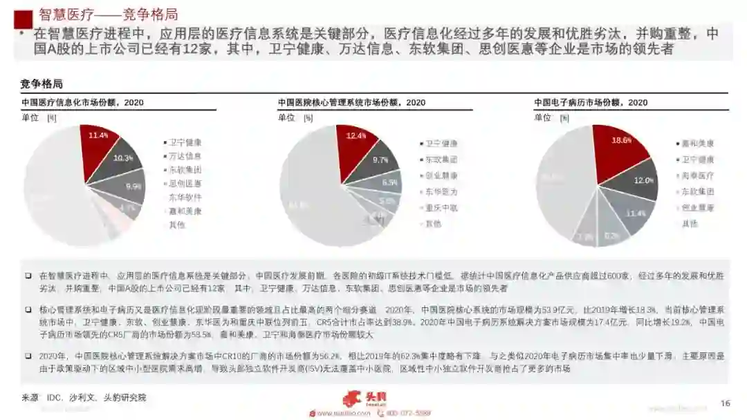 中国智慧医疗发展前期,各医院的初级IT系统技术门槛低,据统计中国医疗信息化产品供应商超过600家,经过多年的发展和优胜劣汰,并购重整中国A股的上市公司已经有12家,其中,卫宁健康、万达信息、东软集团思创医惠等企业是市场的领先者
